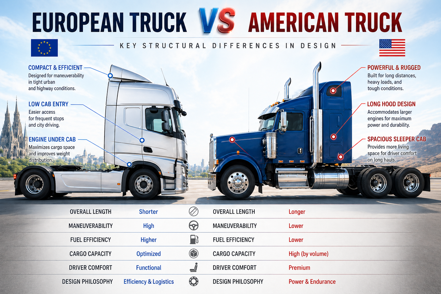 In the end, American and European trucks look different because they solve different transport problems. Europe prioritizes compactness, maneuverability, and maximizing freight within strict dimensional rules. The United States prioritizes highway comfort, service access, and flexibility in tractor design. Same job, different design logic. And once the legal and geographic context is clear, the trucks stop looking unusual—they start looking inevitable.